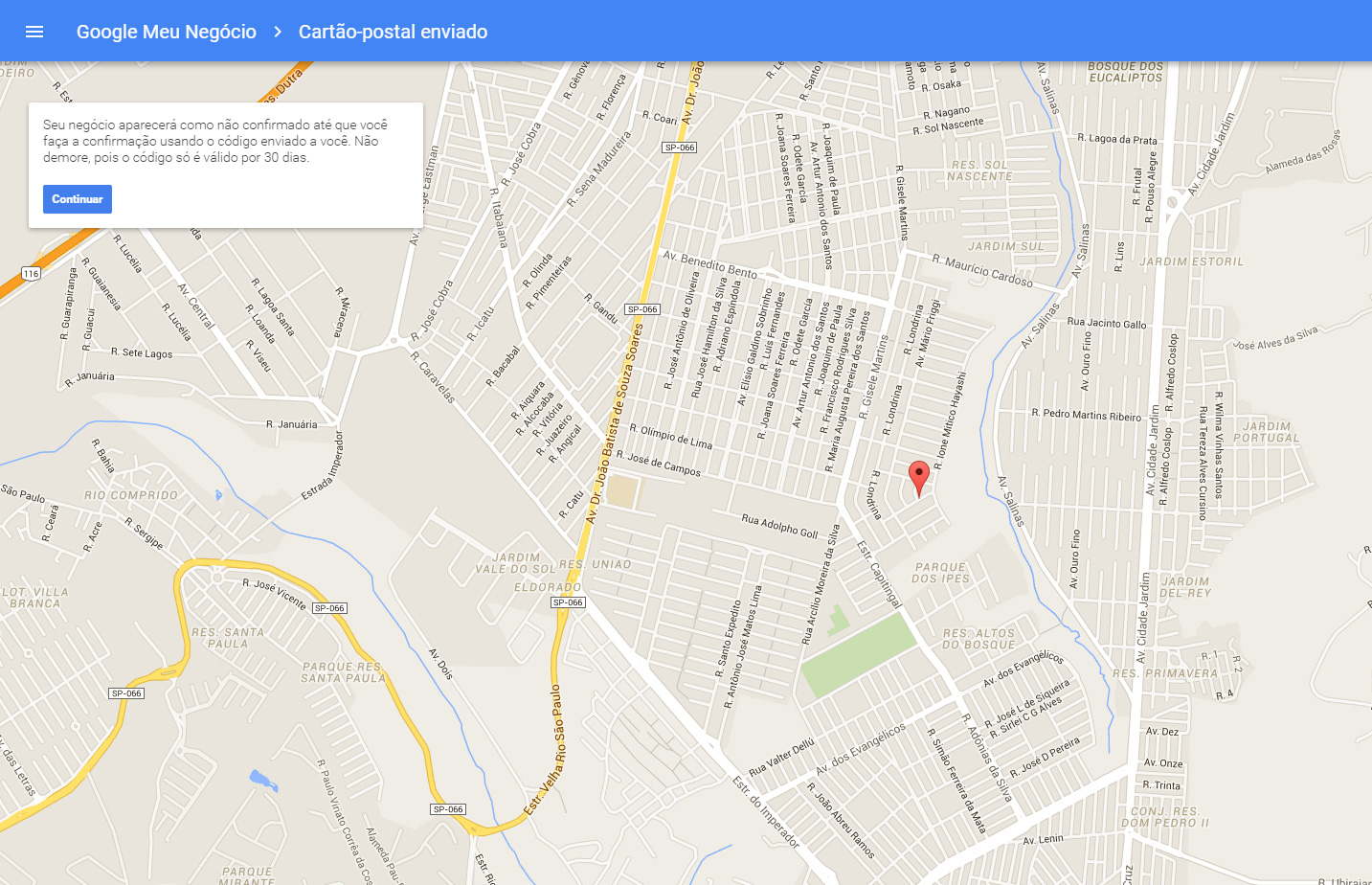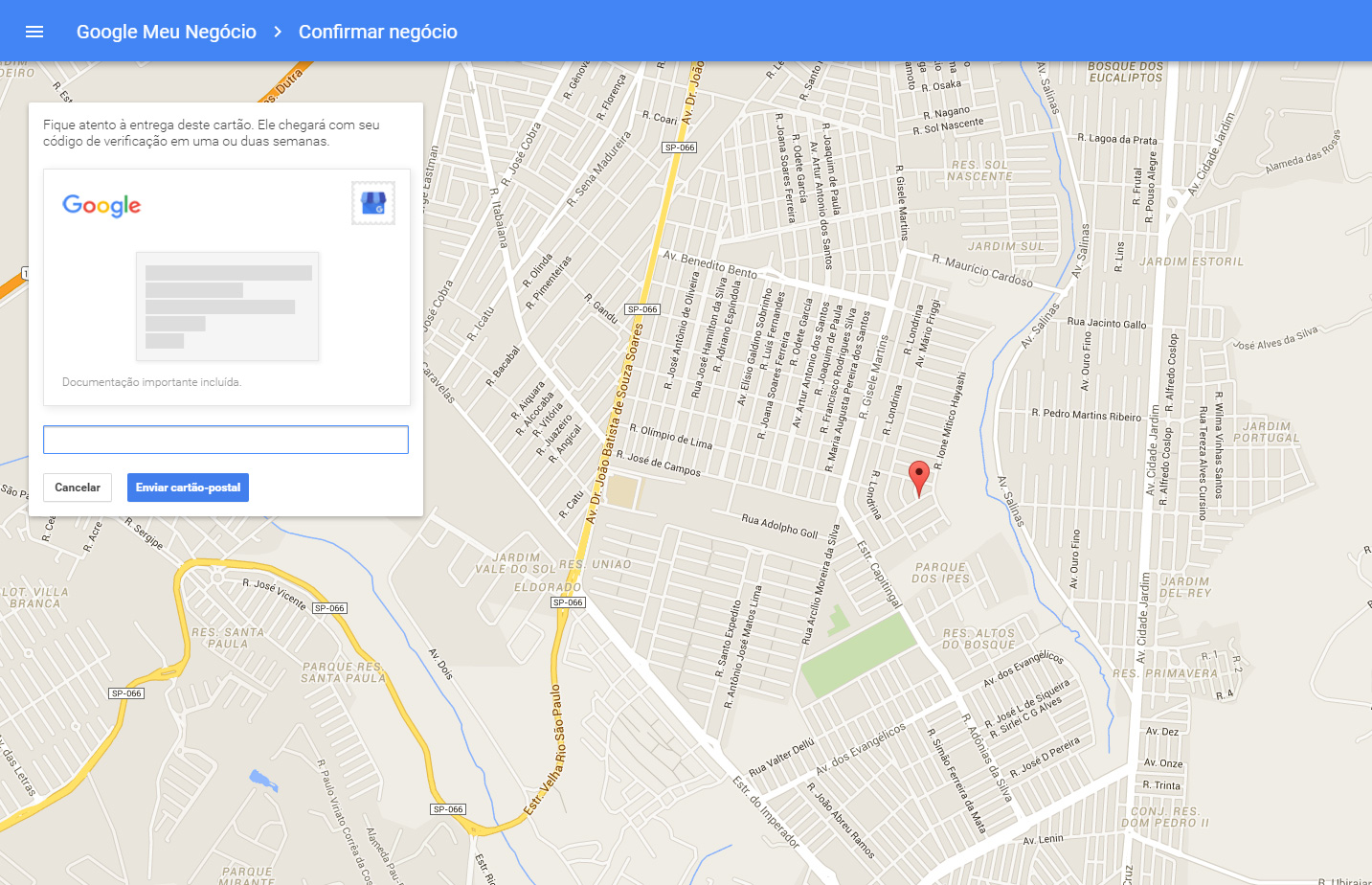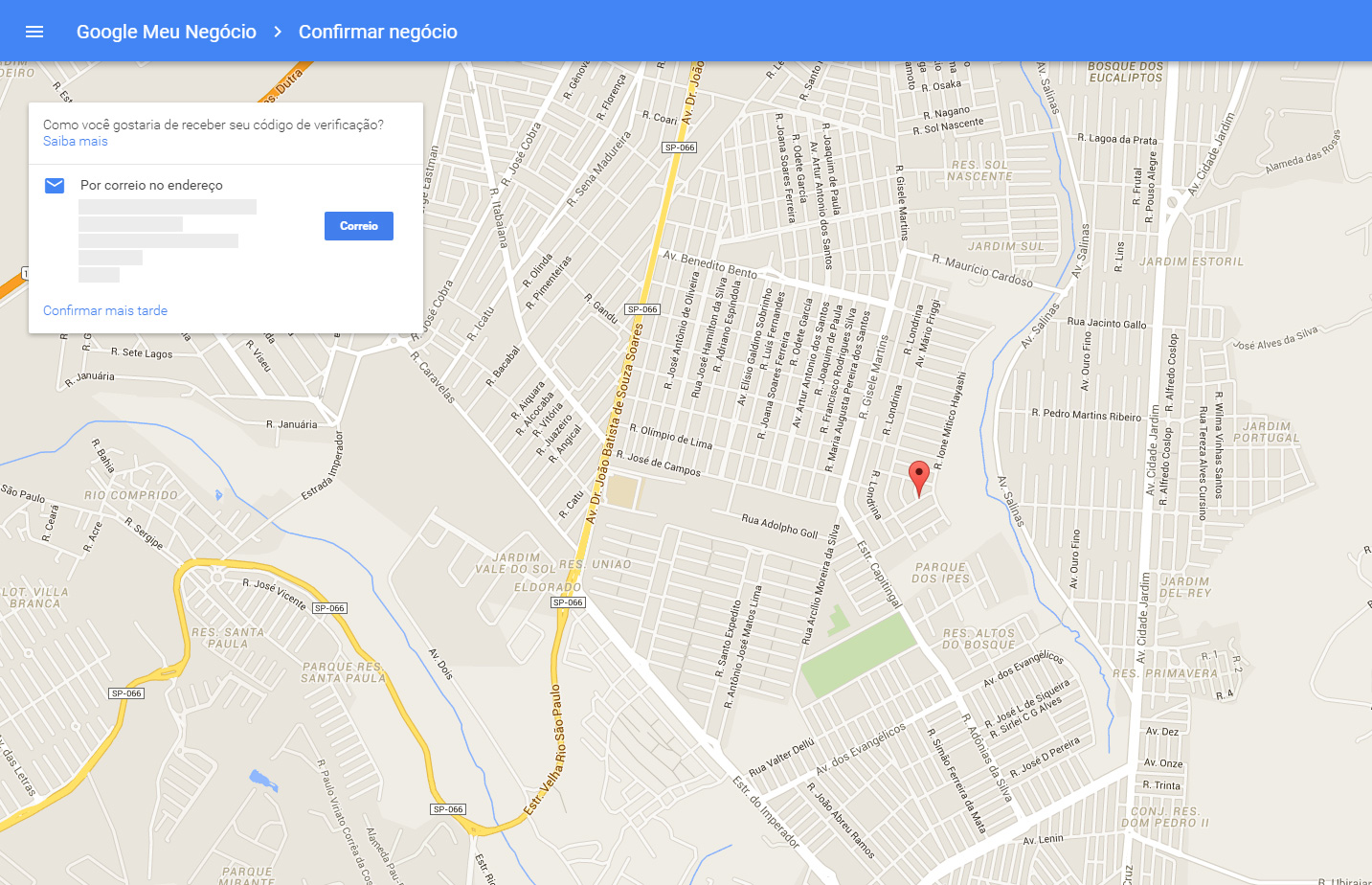 Clique no botão (Correio) para receber a carta de confirmação do Google no endereço da sua empresa, essa carta terá um código para confirmar que o seu endereço está correto.