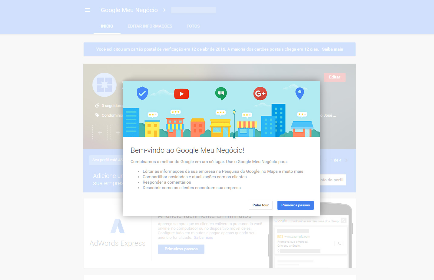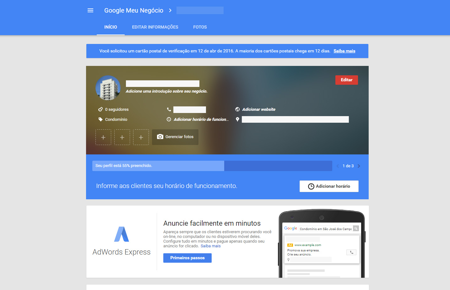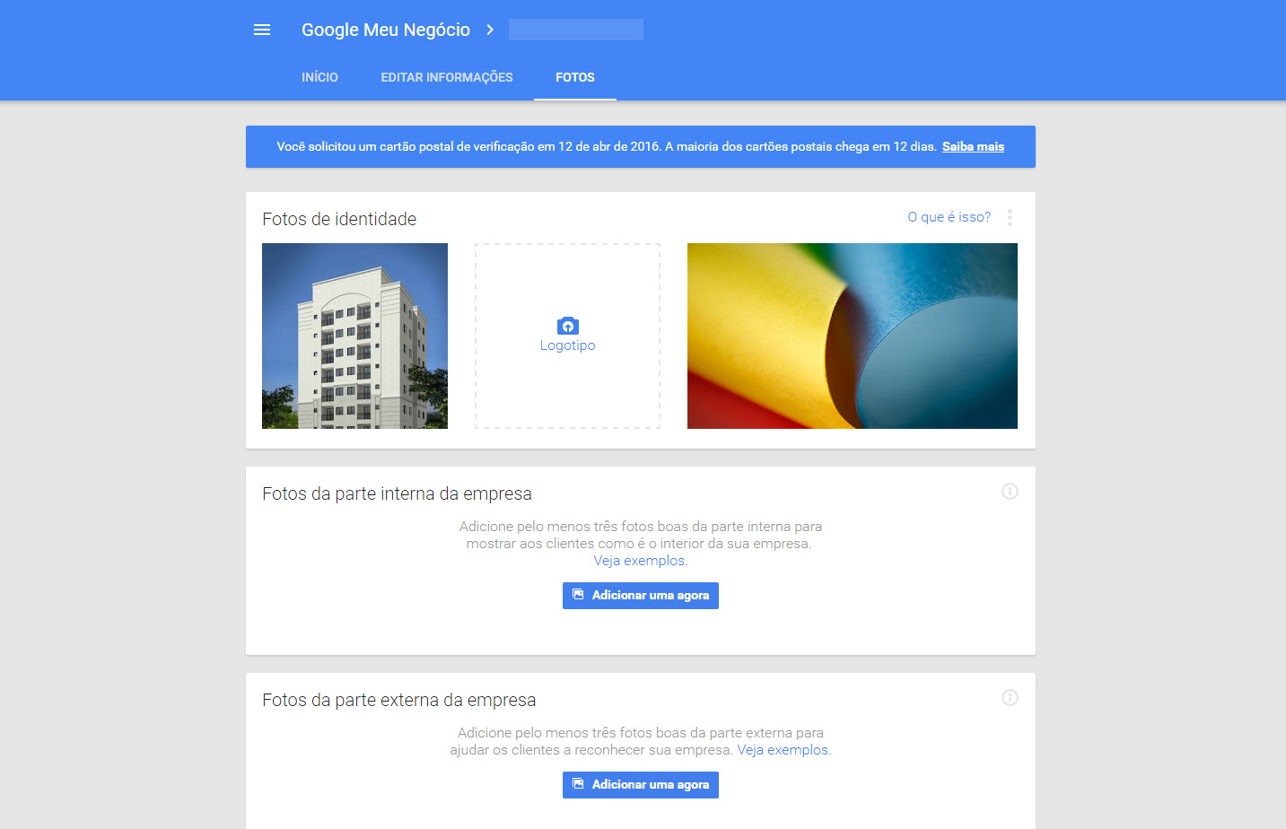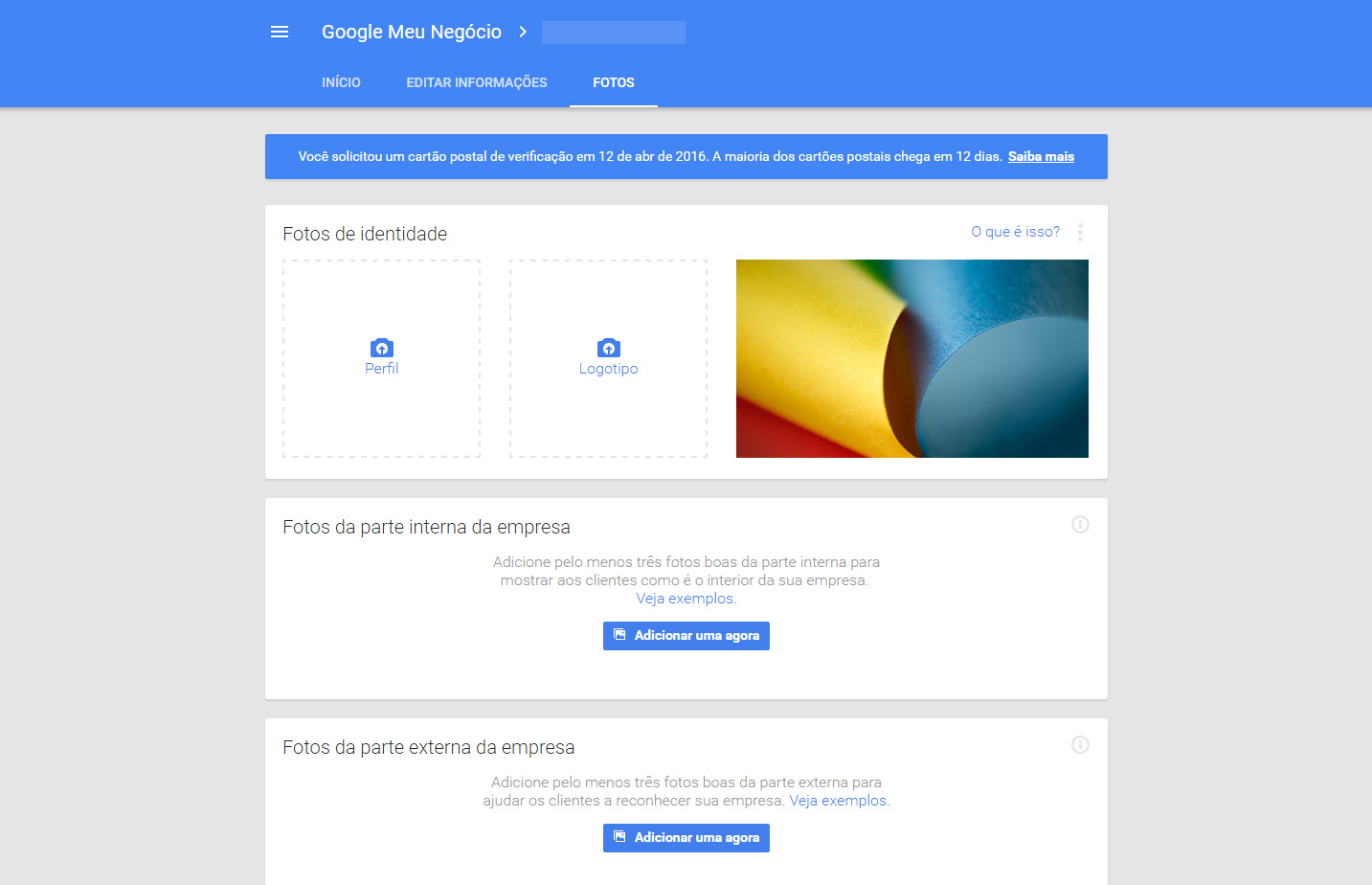 Clique no botão (Correio) para receber a carta de confirmação do Google no endereço da sua empresa, essa carta terá um código para confirmar que o seu endereço está correto.