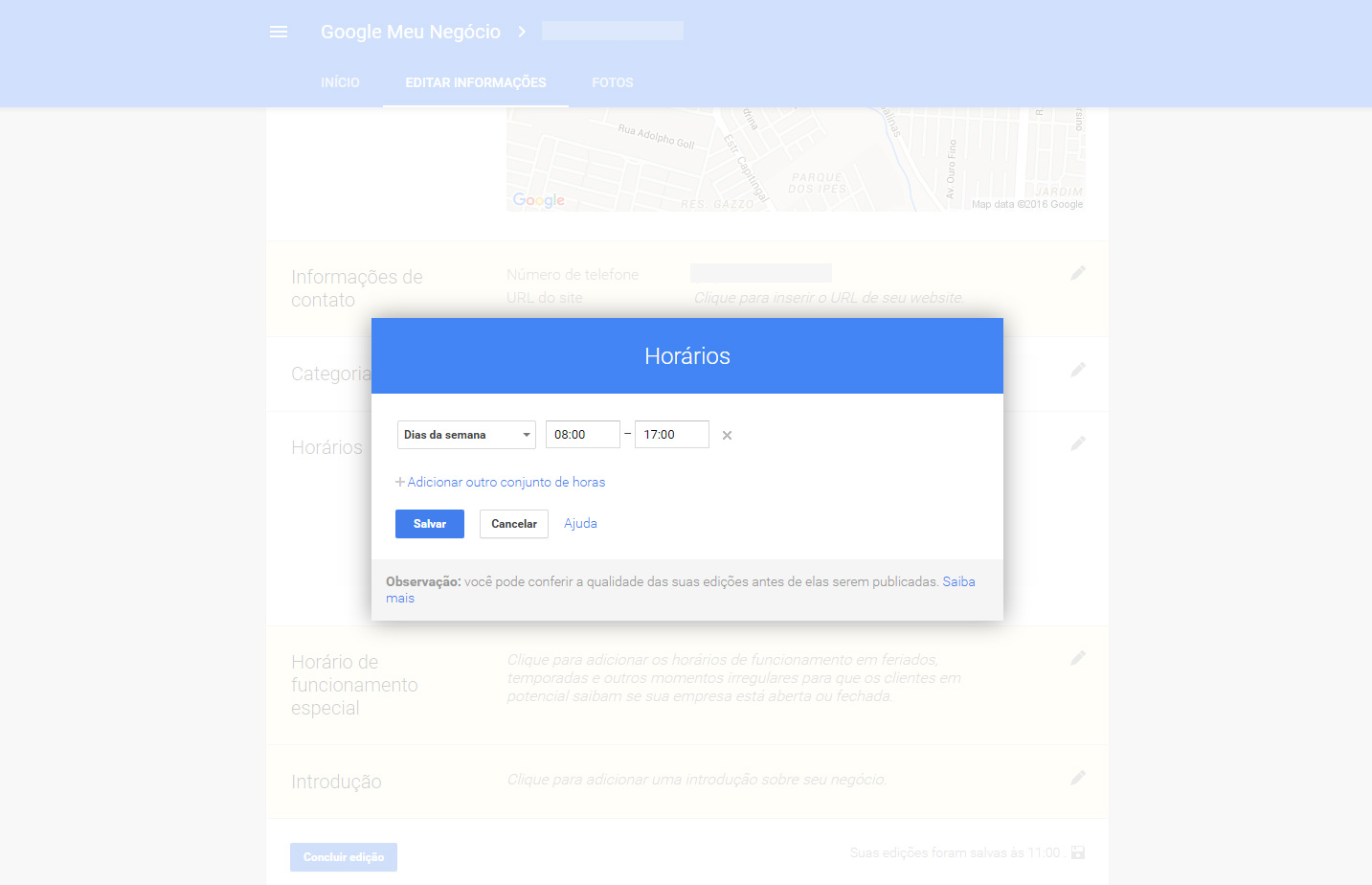 Adicione os dias e horários de funcionamento da sua empresa e clique em: (Salvar)