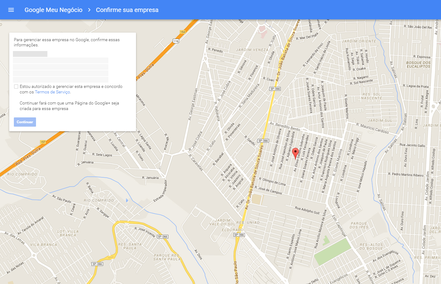 Confirme as informações da empresa, marque a opção: (Estou autorizado a gerenciar esta empresa e concordo com os Termos de Serviço),